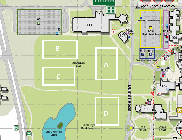 See map below for a layout of pitches. Red pitches only used for small side junior pitches. Futsal courts are between pitch A and dumas road. Building 111 is Curtin Stadium.